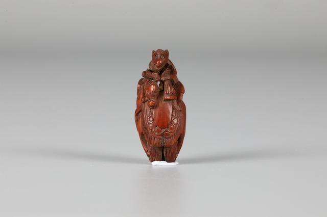 《同庆吉祥》是清中期核雕艺术的杰出代表,以童子骑象的场景为主题,巧妙地将吉祥的寓意与精湛的雕工施诸其上。两位童子形象活泼,头戴软帽,微微前仰,左侧童子一手持罄,另一手搂着右侧童子的后背;右侧童子手持戟,两者姿态亲昵,笑容可掬;大象作为吉祥和智慧的象征,身驮华丽的毯垫,承载着童子。“童”“磬”“戟”“象”合为“同庆吉祥”的美好祝福,整体雕刻手法细腻,线条流畅,象背上毯垫的花边和图腾都被细致刻画,展现了清代核雕艺术的高超技艺。