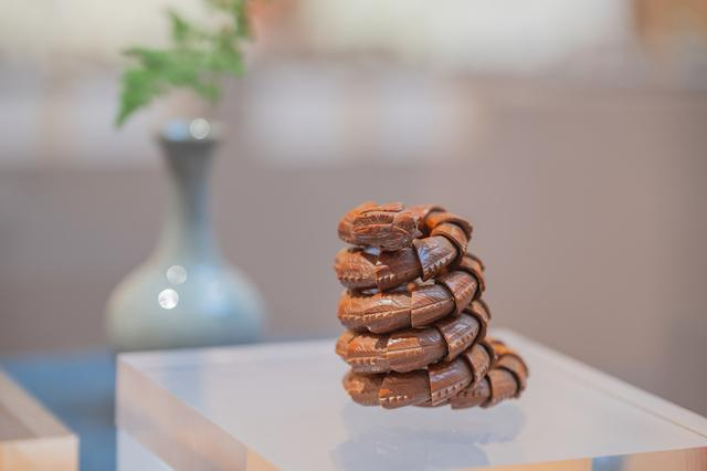 这件别具一格的蛇形核雕手串,以其独特的设计和精湛的工艺,展现了蛇的灵动。在核雕艺术中,受限于果核的尺寸和形状,蛇的形象往往难以完整展现,此作巧妙地利用了可拆解的工艺,将多颗果核嵌套相接,构成了蛇的躯体,赋予了作品如同真蛇一般的灵活性,可以调节和改变形状。手串中的每颗果核上,雕刻师将蛇鳞进行了抽象化的再创造,既保留了蛇的传统特点,又使得整件作品更为凝练和简约。这种创新的手法,让蛇的形象在有限的空间内得到了充分的展现,佩戴起来如同一条小蛇盘桓于小臂之上。