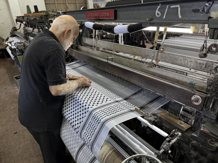 “赫尔巴维”的经理说,在巴勒斯坦生产的库菲耶承载着巴勒斯坦民族的灵魂,而在其他地方生产的——不过是一块普通的布。