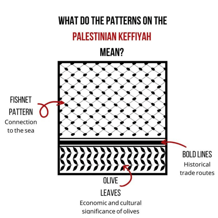 库菲耶(巴勒斯坦头巾),这种原本用来掩盖反殖民斗争者面容和身份的头饰,如今被用来彰显这种身份——反对非法占领、追求民族独立。