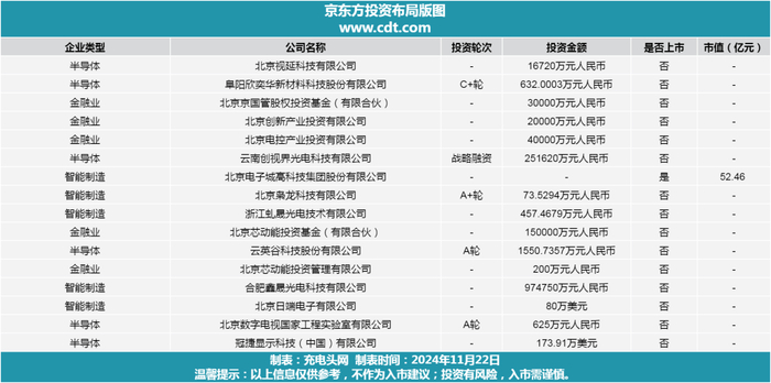 2016年11月29日,京东方对北京电子城高科技集团股份有限公司进行了战略投资,投资金额未披露。2022年,电控产投拟融资6亿元,京东方以自有现金方式向投资标的增资2亿元,北京电控增资3亿元,电子城增资1亿元,用于电控产投的业务发展。双方在电子信息等高科技领域各自有着独特的资源与优势。通过投资合作,能够实现资源共享、优势互补。例如,京东方在显示技术等方面的优势,与电子城在高科技产业园区建设及空间科技服务方面的优势相结合,共同打造区域医工前沿成果转化创新中心及产业服务平台,促进产业升级。