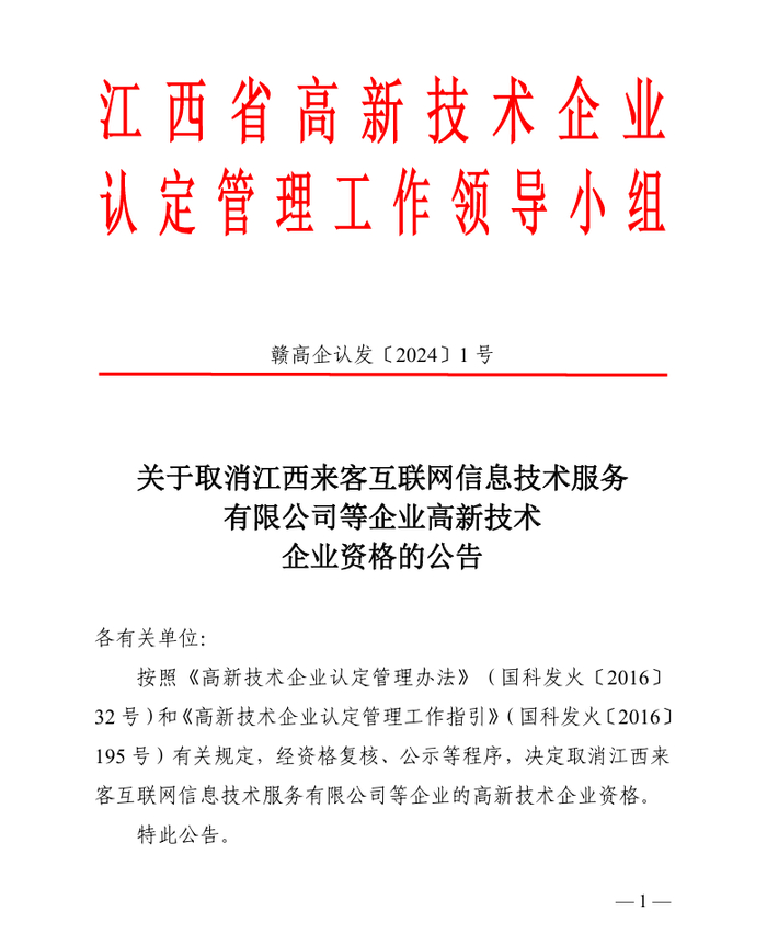 60、2024-02-22江西省江西省认定机构:关于取消江西来客互联网信息技术服务有限公司等企业高新技术企业资格的公告