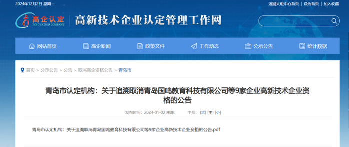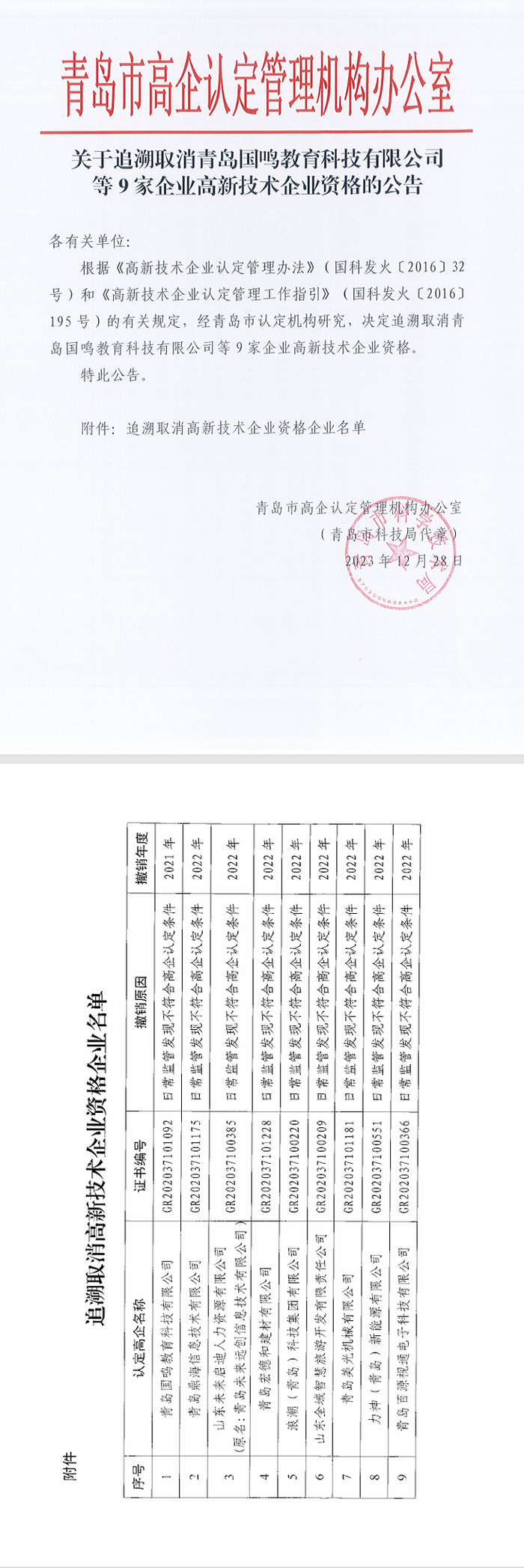 70、2024-01-02青岛市青岛市认定机构:关于追溯取消青岛国鸣教育科技有限公司等9家企业高新技术企业资格的公告