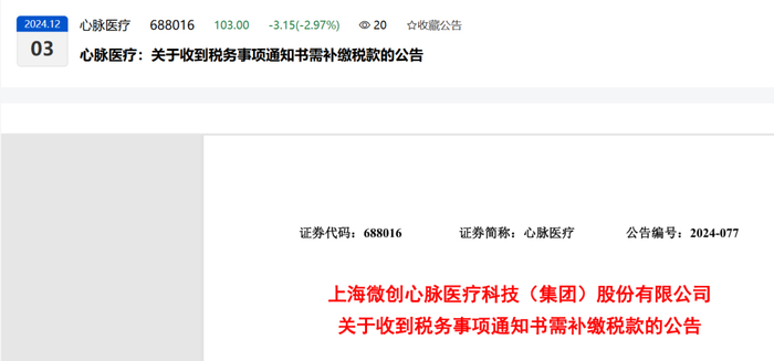 近日,上海微创心脉医疗科技(集团)股份有限公司(以下简称“公司”)收到国家税务总局上海市浦东新区税务局第二税务所(以下简称“浦东新区税务局第二税务所”) 发来的《税务事项通知书》(沪税浦二通〔2024〕1186号)。现将有关事项公告如下: