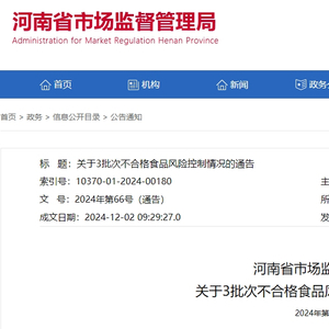 市场监管总局发布的《关于28批次食品抽检不合格情况的通告》(2024年第28号),涉及标称生产企业为河南省的3批次不合格食品。现将涉及不合格批次食品的风险控制情况通告如下: