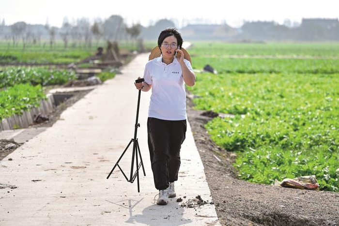 一手拿着支架,一手拿着手机处理客户订单,蒋瑜佳踩着泥走在去农户家直播的路上。