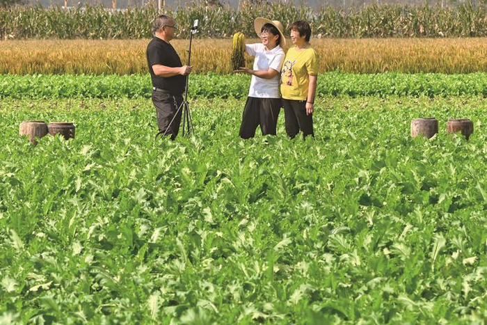 十一月的嘉善县天凝镇田间地头,金黄的稻谷旁是绿油油的“冬雪菜”,村里的“85后”新农人主播蒋瑜佳正和父母通过直播间向全国网友介绍自己家乡的特产——雪菜。