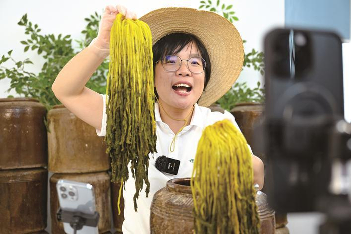 “宝宝们,这里是中国雪菜之乡,我们的雪菜是传统手工、古法腌制而成,非常鲜嫩、香脆,用来做雪菜肉丝面、雪菜小黄鱼、雪菜烧笋、雪菜烧豆腐都可以”“今天给大家炸一波优惠,拼手速,错过就没有了”……11月4日,蒋瑜佳准时开播。她头戴一顶宽边草帽,一手环抱着带黄泥的雪菜坛,一手拎着一棵新开坛的雪菜,介绍起自家产品来,蒋瑜佳眉飞色舞,自信满满。和自己的爷爷还有父亲不同的是,她在网上卖菜。