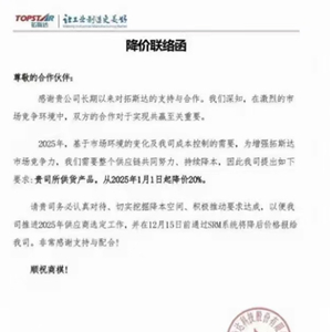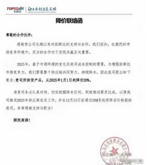 从业界流传的一份联络函来看,落款正是拓斯达,也是要求供应商通过降价的方式,实现“双方合作的共赢”,而且降价幅度较比亚迪更狠,一把就要砍掉20%。