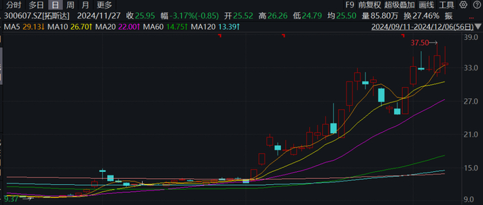 最近这段时间,拓斯达的股价可是牛气到了没朋友的状态,搭上了人情机器人的火爆概念,又似乎抱上华为大腿的火上浇油,公司股价从11月1月收盘价12.22元的相对低点,一路飙涨到12月5日盘中最高时的37.5元,短短一个月就涨了两倍。