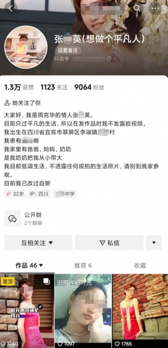 自称周克华情人“张某英”的短视频账号。 上游新闻