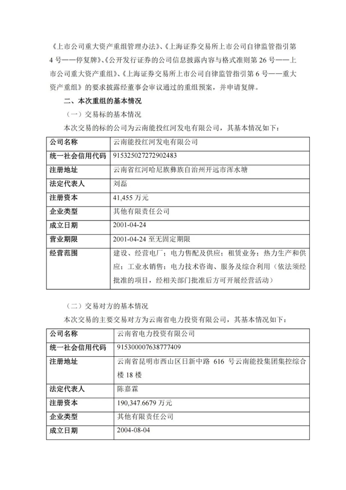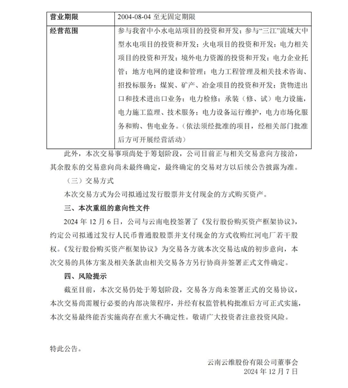 云维股份与云南省电力投资有限公司(以下简称“云南电投”)签署了《发行股份购买资产框架协议》,云南电投为公司控股股东云南能投集团控股子公司。本次交易构成关联交易,预计构成《上市公司重大资产重组管理办法》规定的重大资产重组。
