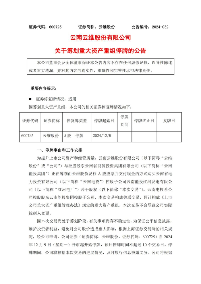 12月7日,云维股份公告称,公司与控股股东云南省能源投资集团有限公司(以下简称“云南能投”)正在筹划由云维股份发行A股股票并支付现金的方式收购云南能投红河发电有限公司(以下简称“红河电厂”)若干股权。