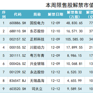 千亿市值电力企业国投电力是本周解禁规模最大的公司。根据公告,公司12月9日有4.88亿股定增限售股上市流通,占总股本的6.55%,约合市值77.54亿元。