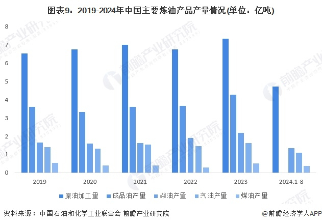 根据国家统计局数据,2012-2018年,中国原油产量先升后降,2019-2023年,我国围绕老油田硬稳产、新油田快突破、海域快上产,大力提升勘探开发力度,原油产量达2.09亿吨,同比增长2.9%。2024年1-8月,中国原油产量为1.43亿吨,较2023年同期增加2.9%。