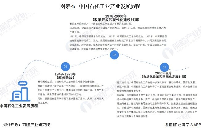 我国石油化工产业发展历程大致可分为三个阶段:1949-1978年(起步阶段),在此阶段中国开发建设了新疆克拉玛依油田、甘肃玉门、青海冷湖等石油天然气生产基地。1978-2000年(改革开放和现代化建设时期),1978年全国原油产量突破亿吨大关,在此阶段成立了中国海洋石油、中石化、新星石油等企业。2000年至今(市场化改革和国际化发展时期)。此阶段中国石油化学产业进一步深化改革,推动市场化、国际化发展,成为了全球石油化学市场的重要参与者。
