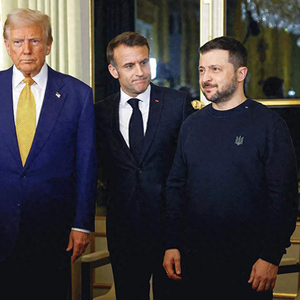 当地时间2024年12月7日,法国巴黎,法国总统马克龙、美国当选总统特朗普和乌克兰总统泽连斯基在爱丽舍宫举行会谈。视觉中国 图