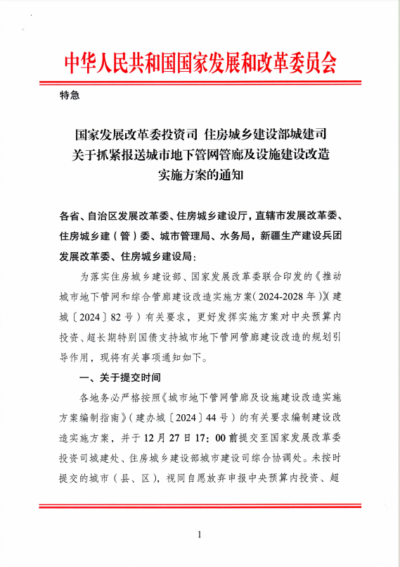 目前,市场上有更大规模刺激政策的预期。强刺激投向哪?城市地下管网一定是一个重要方向。下列网传通知,要求各地编制地下管网建造改造实施方案,于12月27日前报发改委,逾期未报的城市(县、区),视为自愿放弃申报中央预算内资金、超长期特别国债资金。