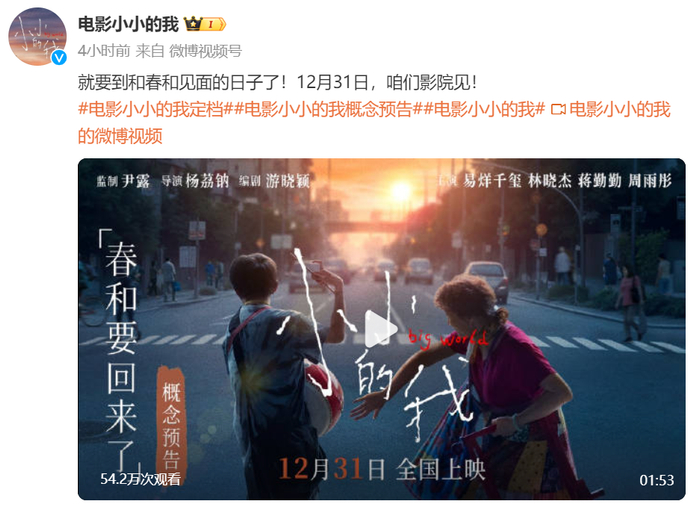 12月9日,电影《小小的我》官方账号宣布定档12月31日,并发布概念预告和电影海报。