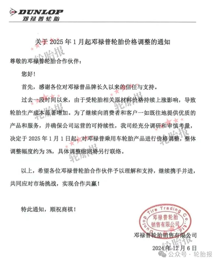 2025年1月1日起,全球知名轮胎制造商邓禄普宣布,由于原材料价格持续上涨,其乘用车轮胎产品线将实施约3%的价格上调。