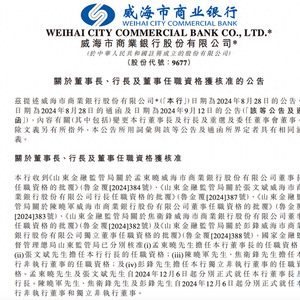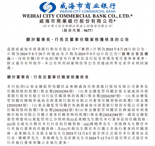 根据公告,威海银行收到国家金融监督管理总局山东监管局批复,分别核准孟东晓担任董事长,张文斌担任行长,陈晓军、焦卫锋担任非执行董事,彭锋担任独立非执行董事的任职资格。