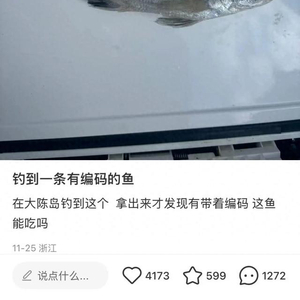 最近,一位浙江台州网友在社交媒体求助,称自己在大陈岛钓到一条有编码的鱼,好奇这条鱼能不能吃,并附上了一张图片。