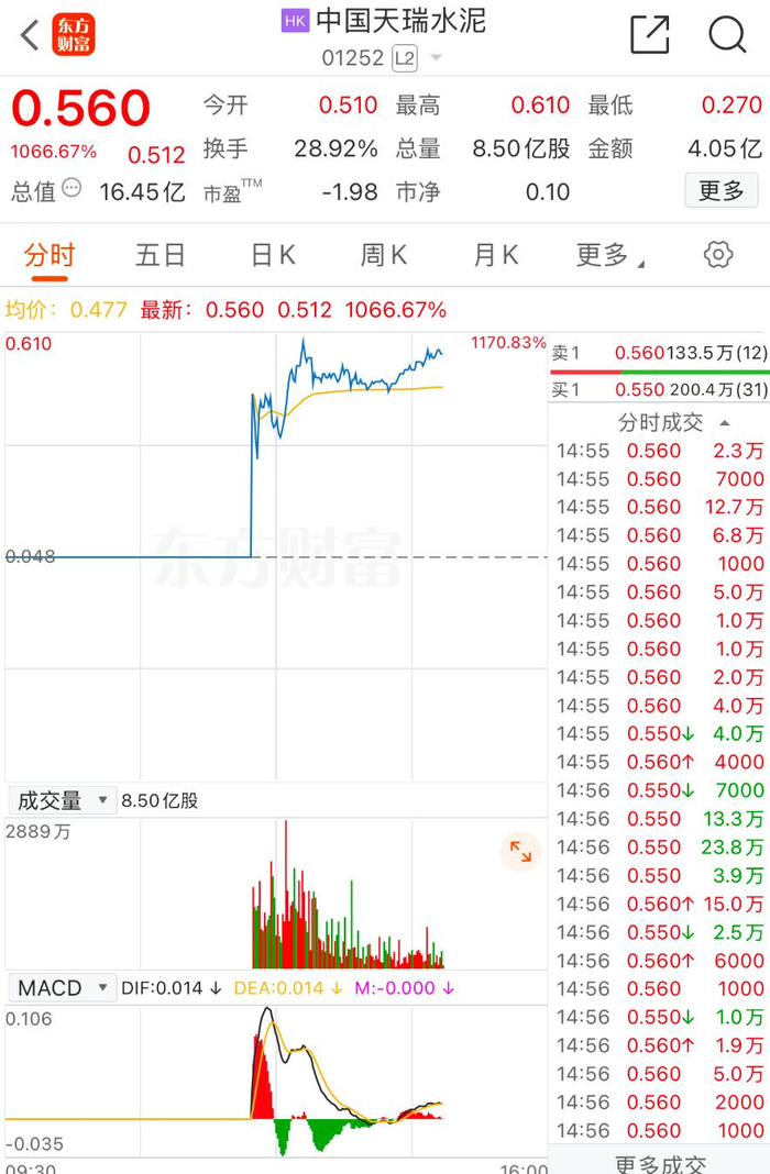 近8个月后复牌 港股中国天瑞水泥午后涨超1000%
