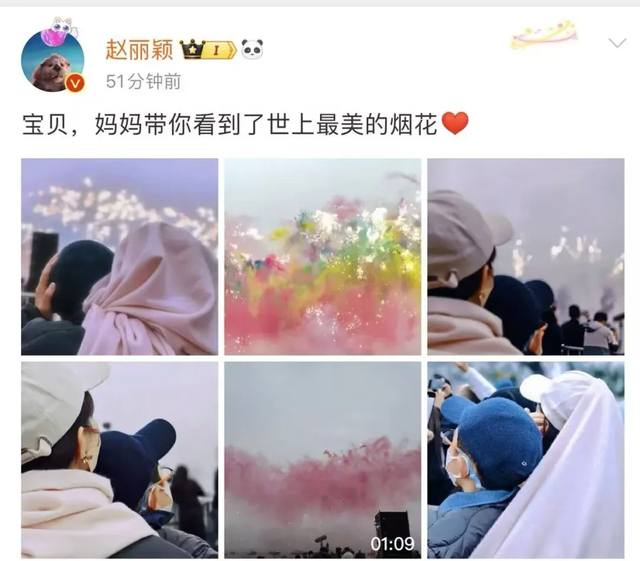 赵丽颖此次是带孩子一起来看烟花,她发微博深情告白:“宝贝,妈妈带你看到了世上最美的烟花!”