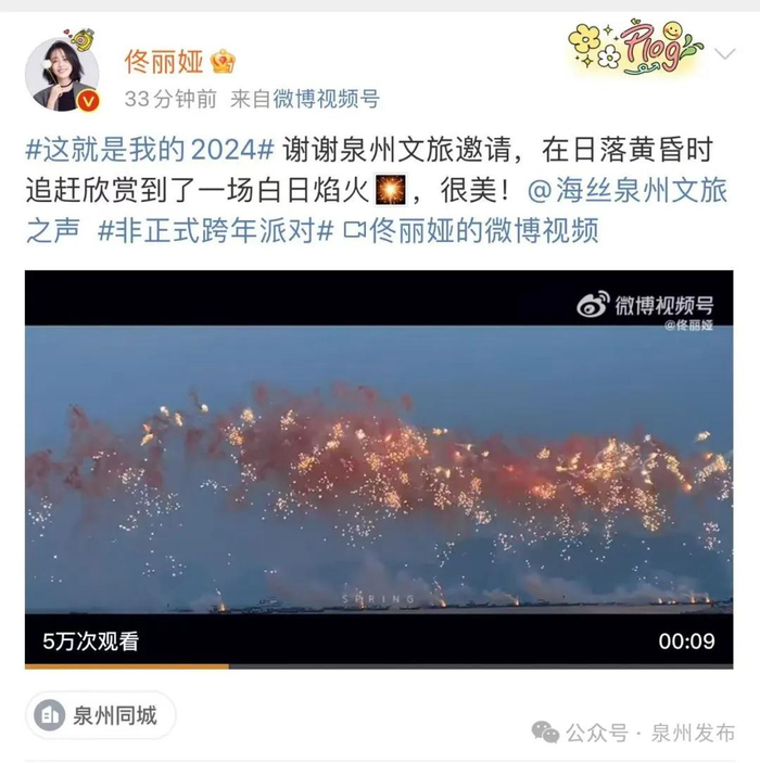 佟丽娅发微博点赞:“谢谢泉州文旅邀请,在日落黄昏时追赶欣赏到了一场白日焰火🎇,很美!”