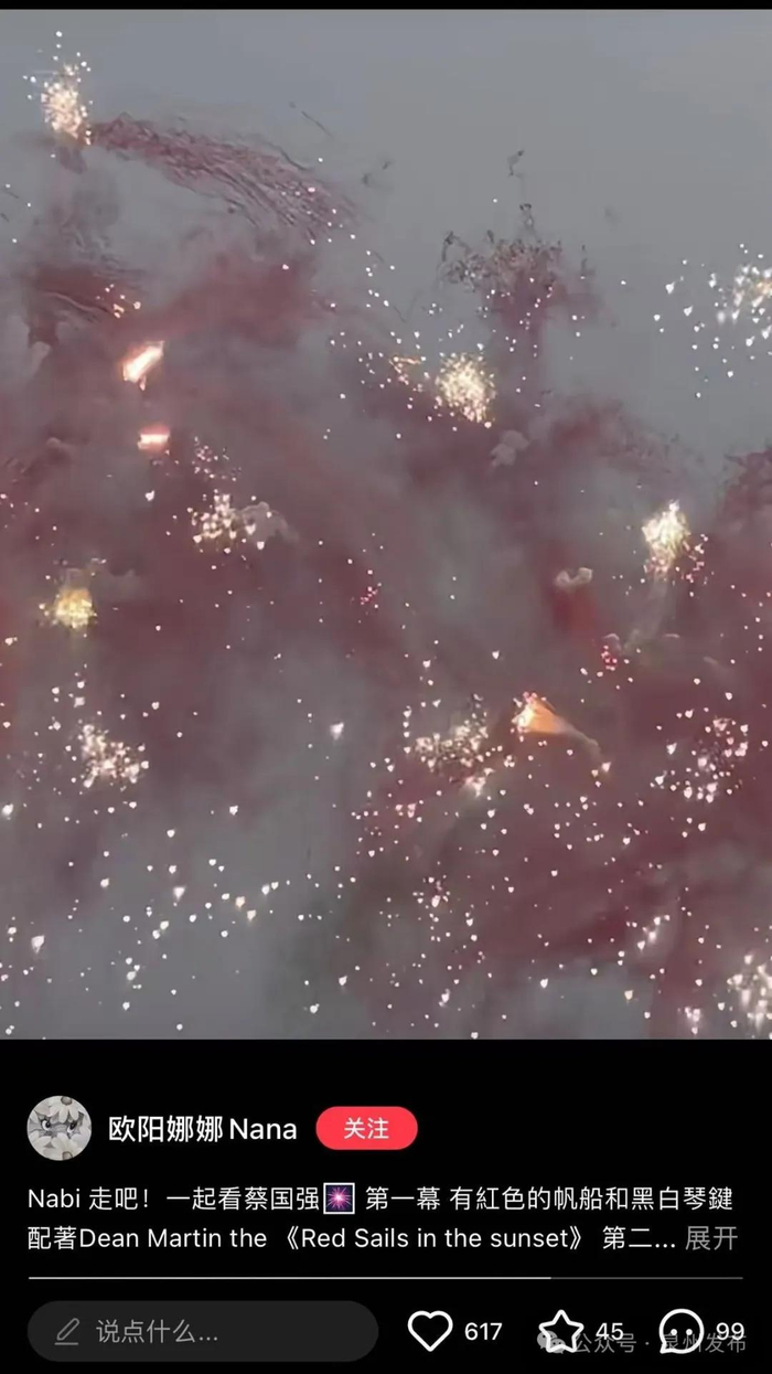 不少现场观众在社交媒体上分享此次观演感受,有人说:“不完美的艺术,像极了人生。”亦有人说:“此刻,一场BE(Bad Ending)美学诞生,意难平。”对于此次“不完整”的烟花秀,不少人直呼太遗憾,也有人表示理解,期待蔡国强今后的烟花作品。