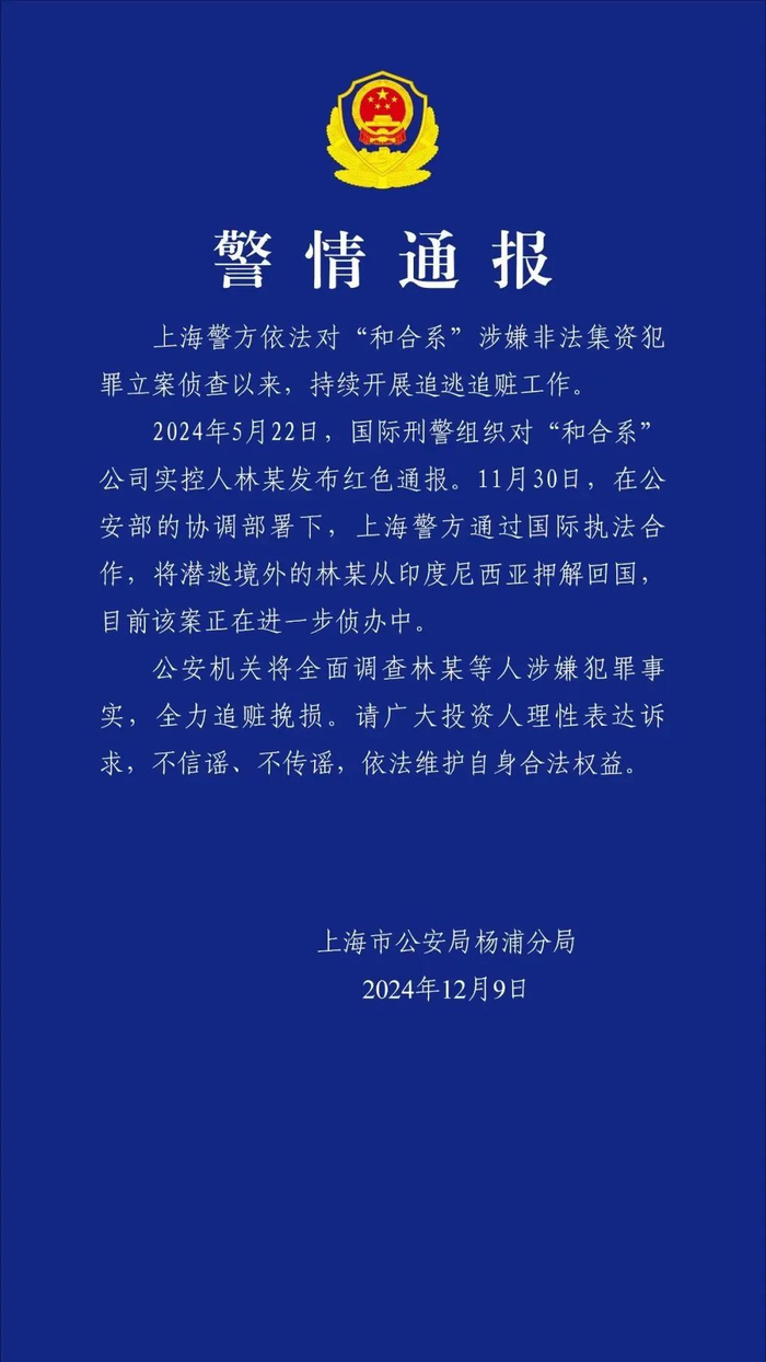12月9日,上海市公安局杨浦分局发布警情通报称,上海警方依法对“和合系”涉嫌非法集资犯罪立案侦查以来,持续开展追逃追赃工作。据警情通报,2024年5月22日,国际刑警组织对“和合系”公司实控人林某发布红色通报。11月30日,在公安部的协调部署下,上海警方通过国际执法合作,将潜逃境外的林某从印度尼西亚押解回国,目前该案正在进一步侦办中。