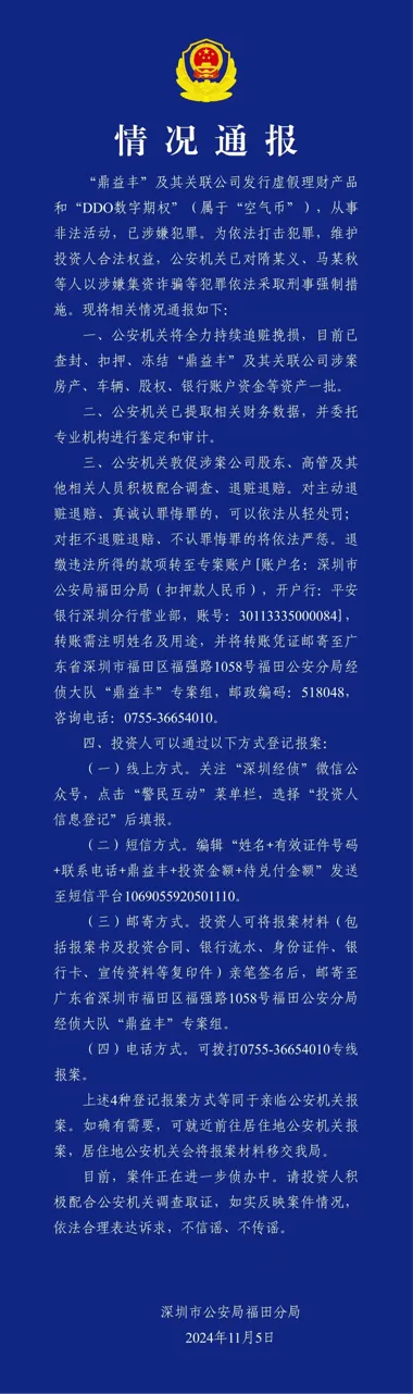 11月5日,深圳市公安局福田分局发布通报称,鼎益丰及其关联公司发行虚假理财产品和“DDO数字期权”(属于“空气币”),从事非法活动,已涉嫌犯罪。为依法打击犯罪,维护投资人合法权益,公安机关已对隋某义、马某秋等人以涉嫌集资诈骗等犯罪依法采取刑事强制措施。
