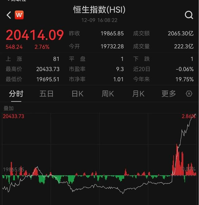 政治局会议通稿发出后,港股尚在交易中,恒生科技率先拉升,收盘后,香港恒生指数收涨2.76%,恒生指数重返2万点;恒生科技指数涨4.3%。