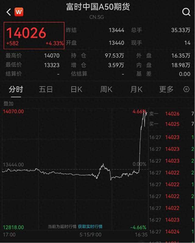 政治局会议通稿一出,市场快速给出反馈,3倍做多富时中国ETF夜盘一度涨超17%。截至记者发稿,富时中国A50指数期货涨一度涨至4.66%。