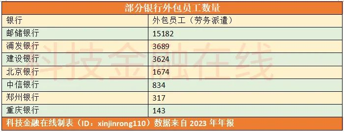 浦发银行与建设银行2023年底,分别有外包员工3689人和3624人。