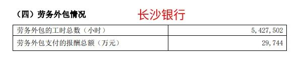 2023年,长沙银行劳务外包工时总数5,427,502小时,劳务外包支付的报酬总额29,744万元,约合54.8元/小时。