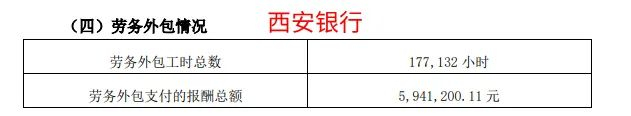 西安银行披露了劳务外包用工情况,2023年,该行劳务外包工时总数177132小时,劳务外包支付的报酬总额5,941,200.11元,约合33.54元/小时。