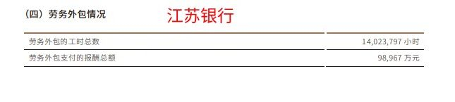 2023年,江苏银行劳务外包工时总数14,023,797小时,劳务外包支付的报酬总额98,967万元,约合70.57元/小时。