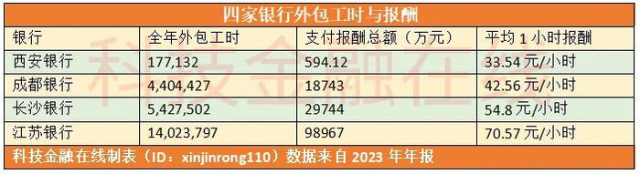 江苏银行外包工时最多,超过了1400万小时,成都银行有440万小时,长沙银行有543万小时,西安银行较少,为17.7万小时。