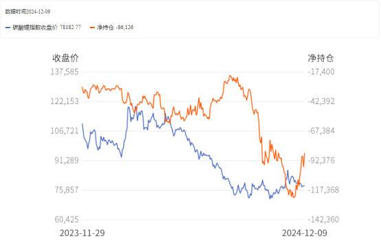 12月9日,碳酸锂前20名期货公司(全月份合约加总)多单持仓20.32万手,空单持仓28.94万手,多空比0.7。净持仓为-8.61万手,相较上日增加1.18万手。