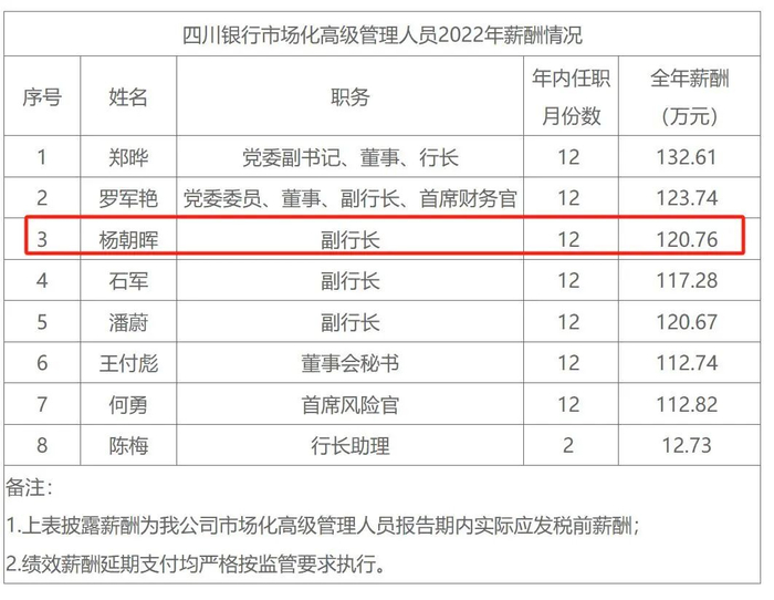作为川发资产输送的人才,杨朝晖在四川银行的待遇颇为优渥。据四川银行发布的市场化高级管理人员2022年薪酬情况,杨朝晖2022年度的薪酬为120.76万元,较2021年上涨23.41%,仅次于该行行长郑晔和副行长、董事兼首席财务官的罗军艳。
