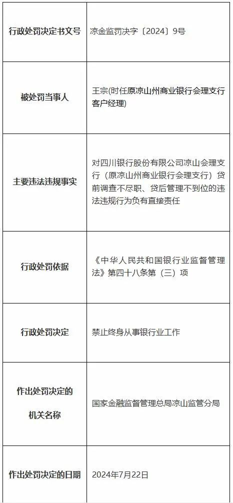 2024年7月,国家金融监督管理总局发布一则行政处罚决定。其中,时任原凉山州商业银行会理支行客户经理王宗因对四川银行凉山会理支行(原凉山州商业银行会理支行)贷前调查不尽职、贷后管理不到位的违法违规行为负有直接责任而被禁止终身从事银行业工作。