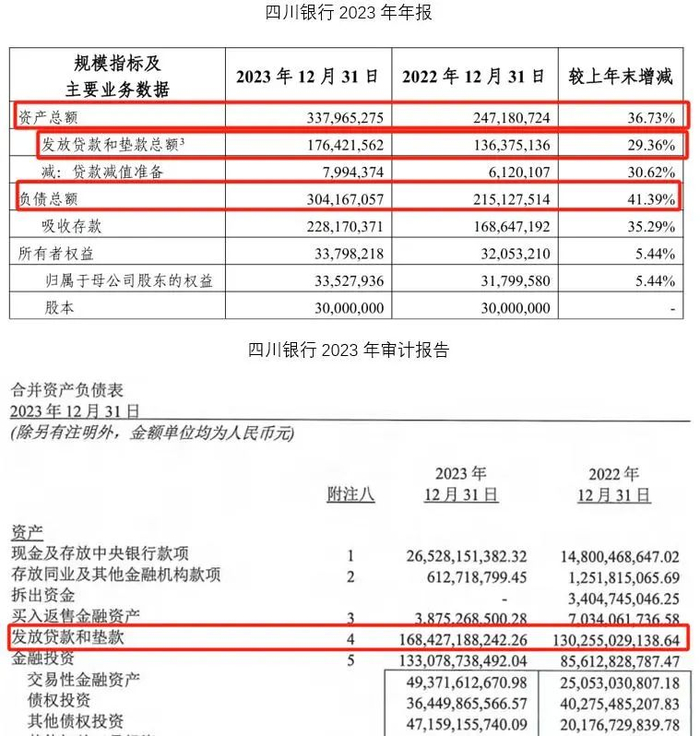 2023年年报显示,截至2023年末,四川银行的资产总额为3379.65亿元,2022年末则为2471.81亿元,但《计划》中分别为3365.38亿元、2443.11亿元。同时,四川银行2023年末的负债总额在2023年年报中为3041.67亿元,但在《计划》中则为2125亿元。