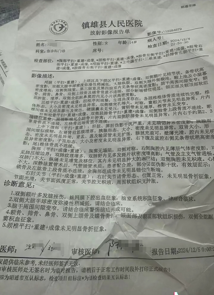 网传视频显示,女生的母亲表示,女儿出事之前情绪正常,还曾劝自己冷静。而在网上发布的一张镇雄县人民医院的放射影像报告单中,都市现场记者注意到,检查时间为12月4日晚上10点53分,检查者为一名14岁女孩。