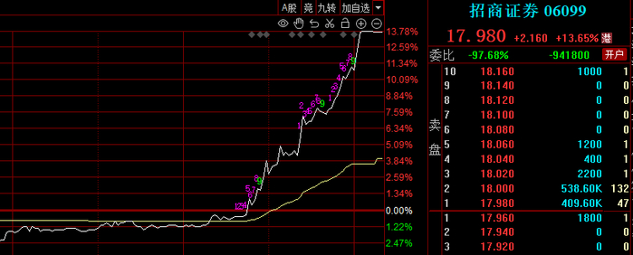 A股收盘后,恒生指数强势拉升,港股中资券商股尾盘集体走强,招商证券涨超10%,光大证券、中信证券、中信建投证券、中金公司、中国银河涨超5%。