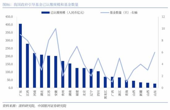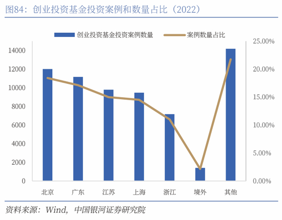 一是土地财政转型下,地方政府因地制宜发展新质生产力。过去土地财政发展下,全国基建普遍过剩,未来大多数三、四线地方政府将更过回归民生相关的基本职能,而一、二线城市和核心都市圈的地方政府拥有更多人力和技术资源转向股权财政。实际上,从目前所谓“股权财政”的全国布局来看,创投基金和政府引导基金主要聚集在发达经济带。截止2022年末,我国创业投资基金案例数量中北京、广东、江苏、上海、浙江合计数量49604个,占全国案例数的76.09%,投资规模合计1.13万亿元,占全国投资总额的71.87%。在地域分布上,科创投资和股权投资的头部聚集效应较为显著。