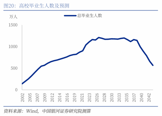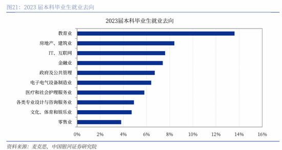 青年就业难的结构性问题更加突出,而且可能会在未来很长一段时间持续。2024年高校毕业生为1179万,极大考验就业市场空间,8月16-24岁(不含在校生)失业率升至18.8%,录得口径调整之后的最高值。2020年疫情发生之后,为了缓解彼时的就业压力,专升本和研究生进行了大幅度扩招,造成了这两年的高校毕业生供应冲击。但根据我们测算,毕业生数量还将持续增长,我们预计高校毕业生将在2026达到1200万人以上,之后至2038年每年将保持1100万人左右的毕业生数量。也就是说今后10年时间均为毕业生高峰。如何匹配、充分利用高学历青年的能力从而实现最经济的发展方式仍需政策的大力支持和疏导。目前经济转型过程中所需要的劳动力与教育体系的匹配度不高,过去几年大学生更多地从事了互联网、教育等行业,学习并扎根制造业就业的人数较少,这导致就业市场出现结构性错配。麦克思研究院《中国大学生就业报告》显示,过去几年我国高校毕业生主要供职于第三产业,尤其是教育、地产、IT、金融等生产性服务业领域。因此,未来10年政策一是要让经济保持一定的增速,以满足劳动力供给的上升;二是要调节就业市场结构性错配问题,通过发展新质生产力创造更多高技术就业的同时,提升制造业就业的吸引力并引导更多毕业生进入制造业。