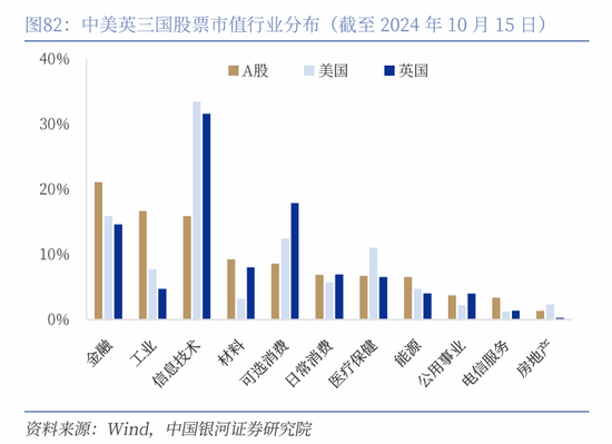 成熟资本市场在支持科技型企业方面发挥作用显著,而我国科技创新企业在资本市场中占比偏低,我国资本市场支持空间可期。以美国为例,美国纳斯达克资本市场主要针对美国高科技及中小企业,2023年,该市场上市公司企业数量达到1332家,而我国与之对应的科创板上市企业数仅为566家。对比我国A股市场和发达国家股票市场行业结构(截至2024年10月15日)可以发现,我国股票市场中高科技企业市值占比仅为16%(数据为信息技术行业),而美国和英国股票市场中信息技术领域占比均高达30%以上。我国资本市场对科技创新的支持力度可进一步增强。