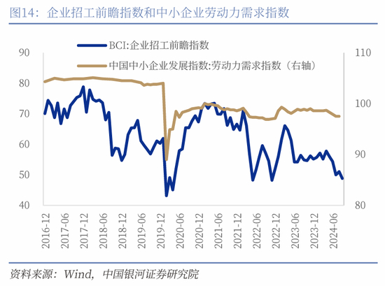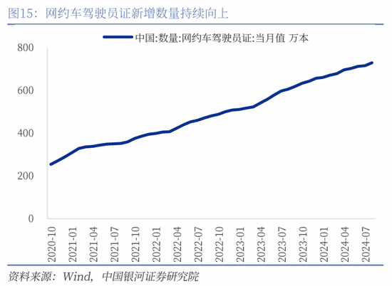 近几个月来,劳动力市场的压力持续增大,除了失业率中枢较去年有所提高之外,其他数据也能从侧面反应劳动力市场情况:(1)失业金保险支出显著增加,8月失业金保险支出录得172.7亿元,同比增长61.3%,这与本地户籍人口的城镇调查失业率更高相匹配。(2)央行储户问卷调查显示,当期就业感受指数和未来就业预期指数中枢从2023年Q1之后显著回落。(3)BCI企业招工前瞻指数和中小企业劳动力需求指数均保持低位,而民营企业和中小企业恰恰又是吸收就业的主要力量;(4)灵活就业人数持续增加,网约车驾驶员证数量在过去三年翻了一倍以上;(5)求职APP活跃用户数增长,显示劳动力供给大幅上行,而企业新增招聘贴数却在9月份进入负增长。
