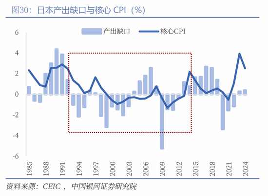 从日本经验来看,一旦实质性陷入通缩,经济将会陷入螺旋下行的恶性循环,货币政策失效的同时,财政政策的效果大大折扣。1989年末,日本经济泡沫达到顶峰,股票和房地产价格极度膨胀。为了遏制过热的经济和资产泡沫,日本央行开始收紧货币政策,大幅提高利率,导致股市和房地产市场的泡沫迅速破裂。泡沫破裂后,东京证券交易所的日经指数暴跌,房地产和土地价格也随之大幅下滑,资产价格在短短几年内几乎腰斩,企业和个人的资产负债表迅速恶化,日本经济陷入长期低迷,需求萎缩。面对经济泡沫破灭,日本当局对于经济复苏以及走出通缩过于乐观的错误估计,使其应对政策迟缓而犹豫。包括货币宽松、财政扩张以及银行的不良贷款处置都显得滞后而保守。这使得产出缺口逐步扩大,1993年-2013年的20年间,产出缺口除少数年份之外始终存在。这带来核心CPI低迷,多数年份处于负值。这期间,GDP平减指数负值运行,名义经济增速始终低于实际经济增速,日本“失去”名义增长将近20年。直到2013年之后安倍经济学登场,日本才逐步走出通缩。